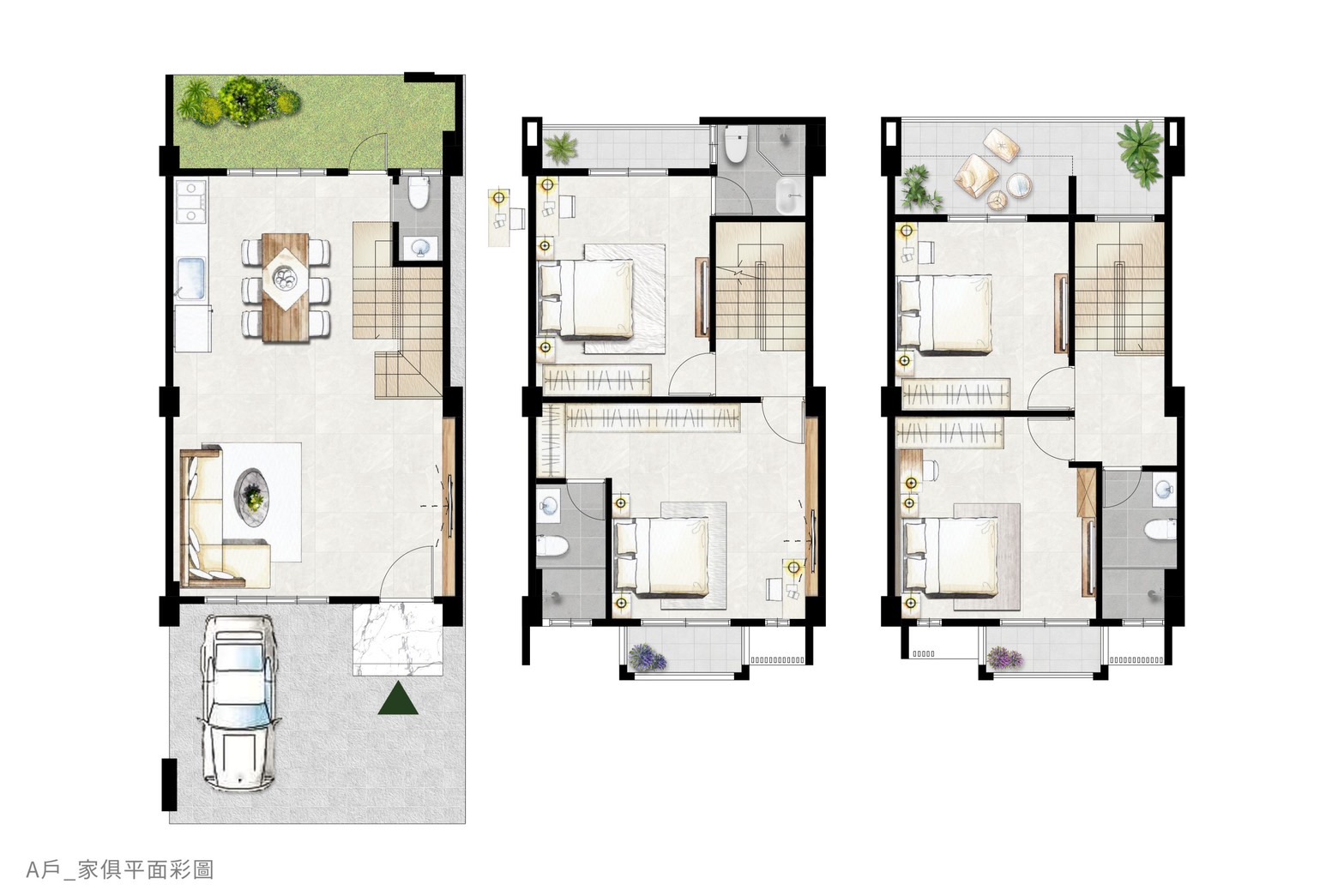 格局配置 ✤ 心.悅生活 建築面寬舒適規劃五米三~六米三,前院雙車位寬裕尺度,滿足多代同堂車位需求,同時引豐沛日光入室; 最佳保護、居住安心承諾,提供防水保固5年,保障每天的生活品質 A戶傢俱配置圖 | 4房2廳4衛